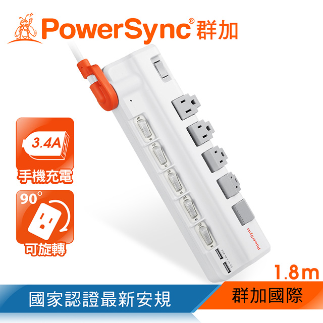 群加 PowerSync 包爾星克 6開5插2埠USB防雷擊抗搖擺旋轉延長線1.8M (TR529118)