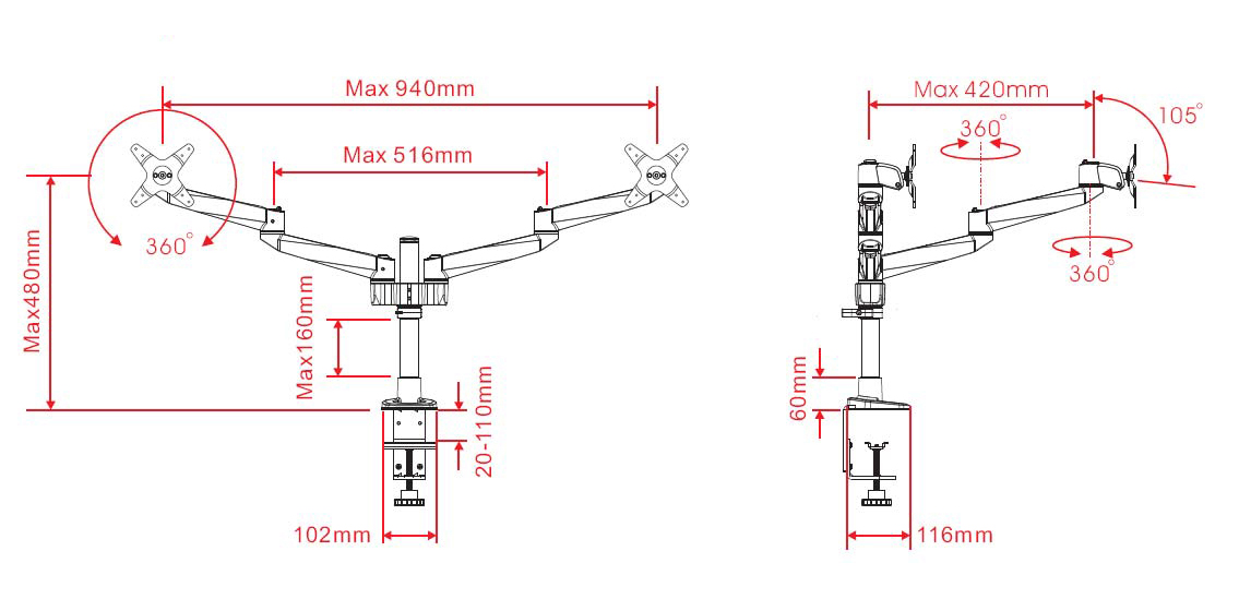 • 最大承載重量:<= 20kg (單支臂最大承載 <= 14kg)