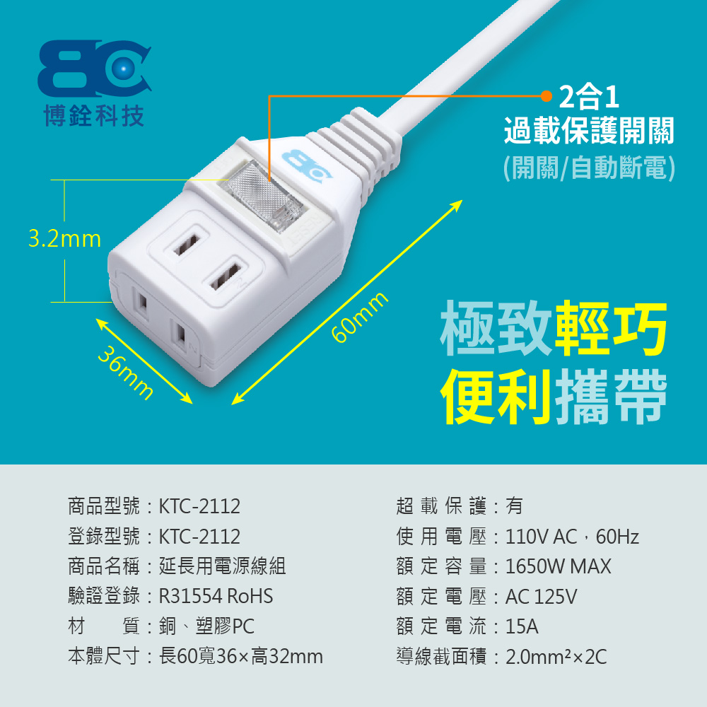 【BC博銓】KTC-211215A/1.2M/1開關2插座2孔中繼延長線