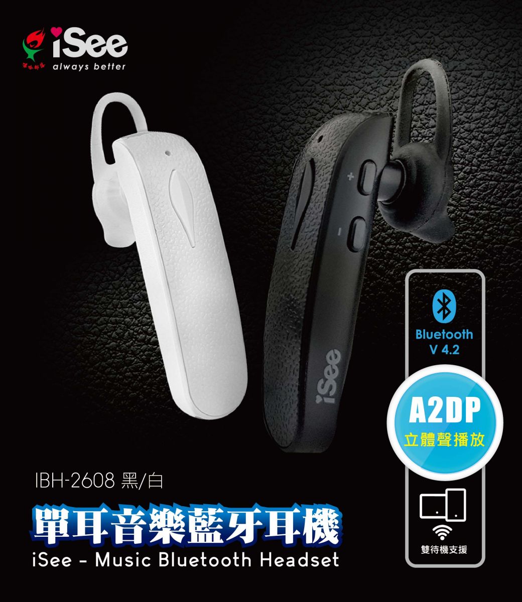 嘻哈 iSee BT4.2 單耳音樂藍牙耳機 (IBH-2608) 白