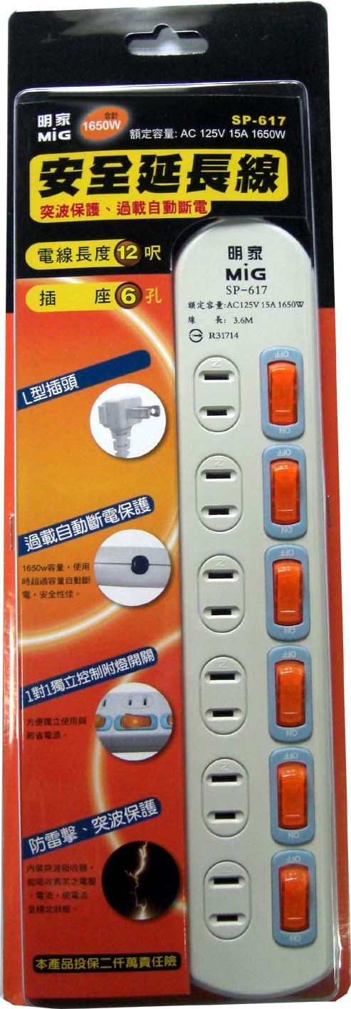 ◆商品名稱:明家家用安全延長線6插6開3.6M