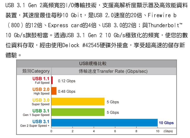 • 最高傳輸速度可達USB 3.1 Gen 2,10Gbps